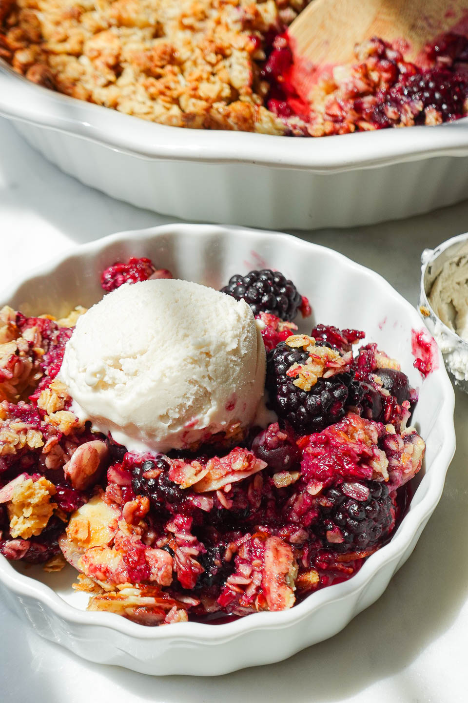 This Healthy Berry Crisp is the perfect summer treat made with fresh or frozen fruit + a nutty crisp topping. It’s vegan, gluten free, refined sugar free, and ready in 30 minutes!