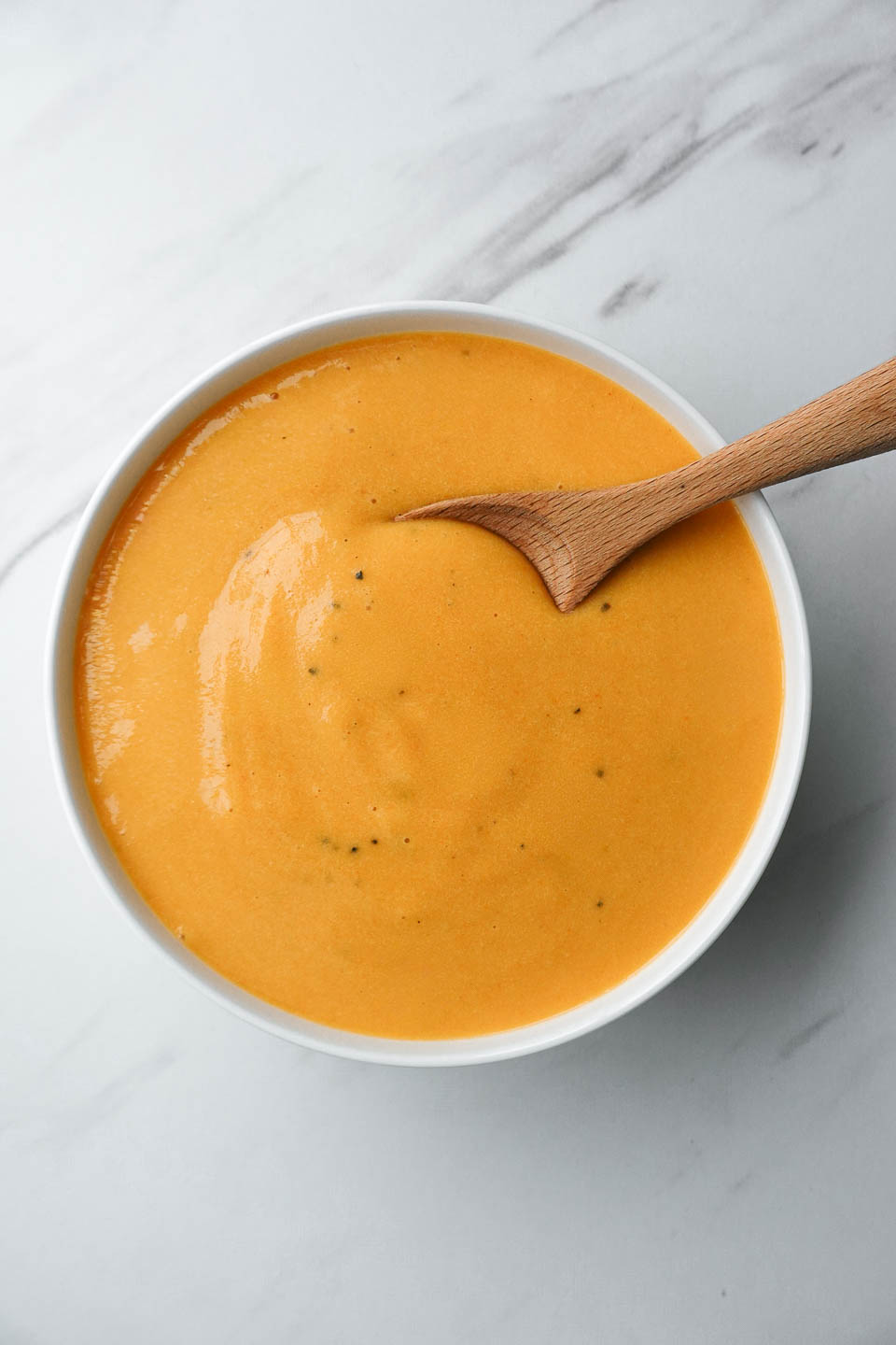 This vegan cheese sauce is made with simple ingredients like potatoes and carrots. No cashews, no nuts, and no complicated steps. Just whole-food ingredients blended into the dreamiest, velvety cheesy sauce.