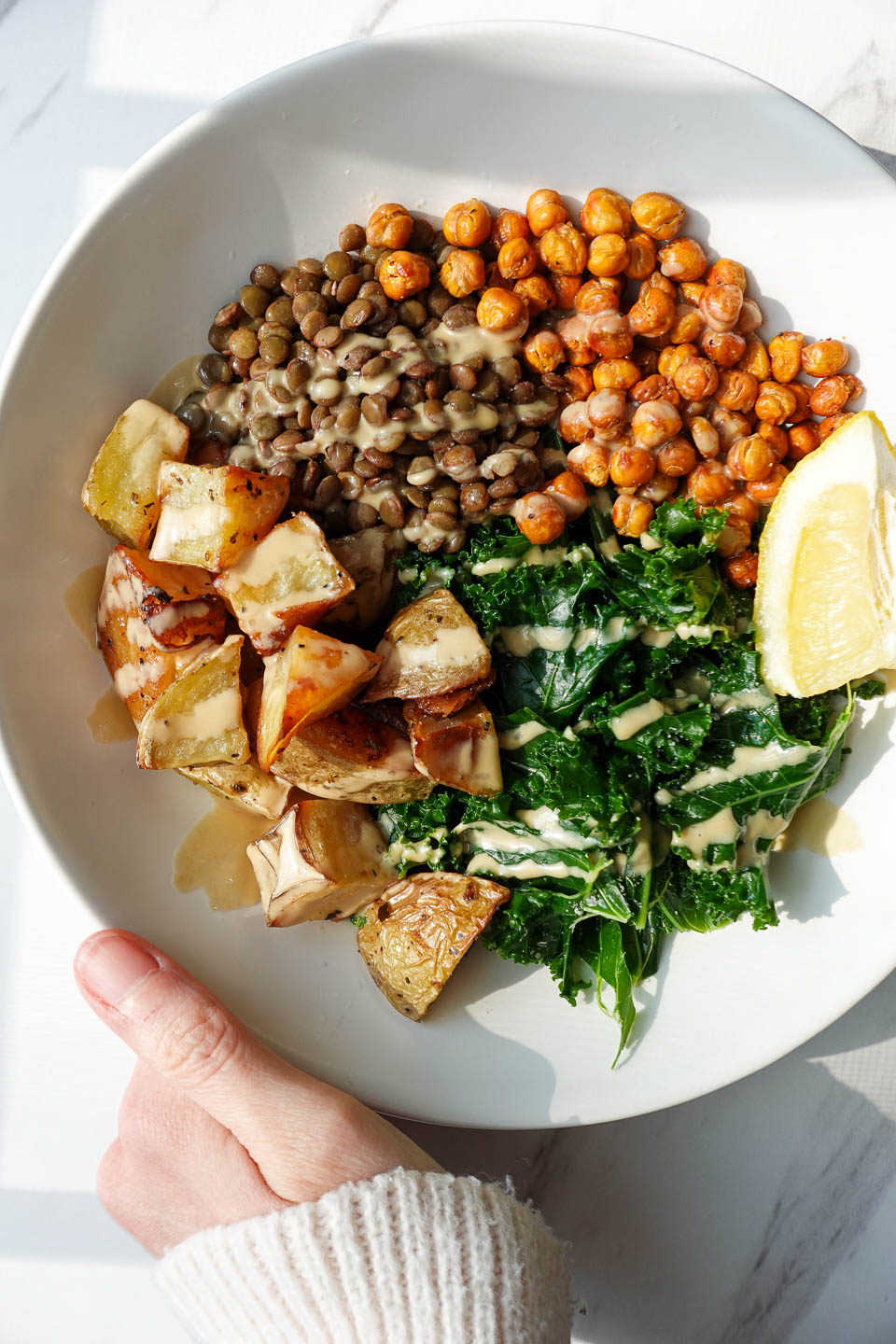 - Assemble the bowl: Add the steamed kale to a large bowl, then layer with roasted potatoes, warm lentils, and crispy chickpeas. Drizzle with the lemon tahini dressing and toss everything together until well coated. Serve warm and enjoy!